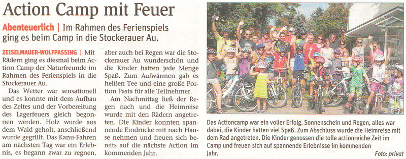 Wir starteten diesmal bereits am Freitag um 15:00 Uhr am Kirchenplatz Zeiselmauer und fuhren mit den Rädern in die Stockerauer Au. Das Wetter war für den Sommer 2014 sensationell und so konnten wir nach der Ankunft dort gleich mit dem Aufbau der Zelte und der Vorbereitung des Lagerfeuers starten. Parallel dazu holten die Kinder Holz aus dem Wald oder spielten auf der großen Spielwiese neben dem Naturfreunde-Haus. Mit einer köstlichen Grillerei klang unser erster Tag gemütlich aus.